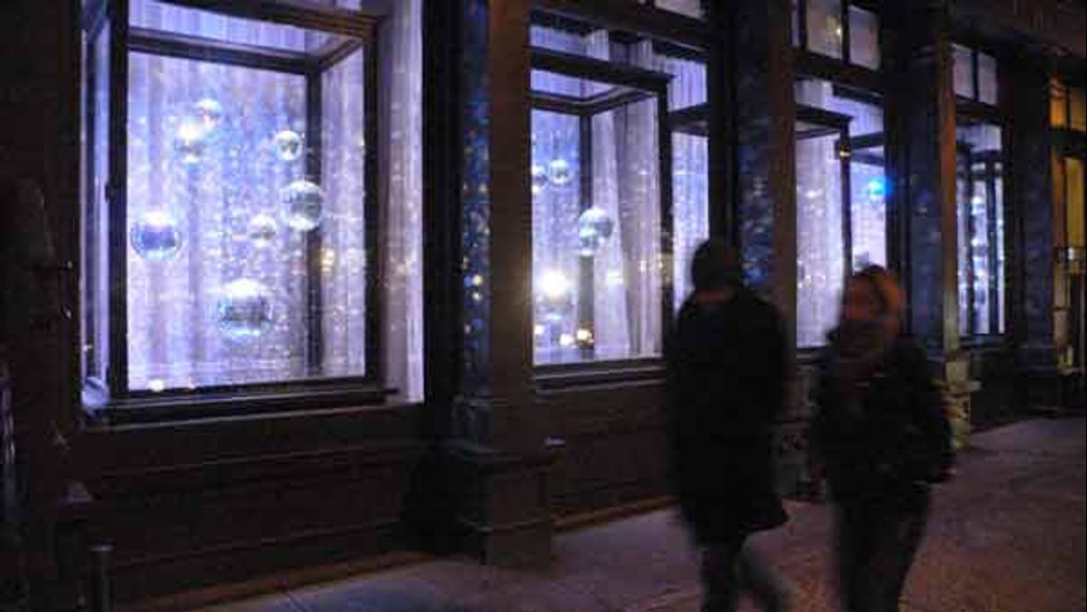 E.R. Butler & Co. celebrates 2010 with a radiant display of 28 mirrored disco balls of varying sizes: 8, 12 and 16 inches. The Austrian-made disco balls are somewhat randomly located within display vitrines and synchronized on rotational motors to reflect the computerized ERCO DALI Cantax LV halogen spots and LV LED varichrome display lighting system.