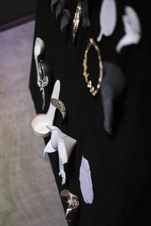 Gamwell uses a sophisticated technical process involving bone china, phosphate dyes, water, and semiprecious metals to create sculptural objects that seductively straddle the line between the fine and applied arts. The result is beautifully disconcerting: fine china and flatware firmly reimagined through the chaotic logic of the natural world.