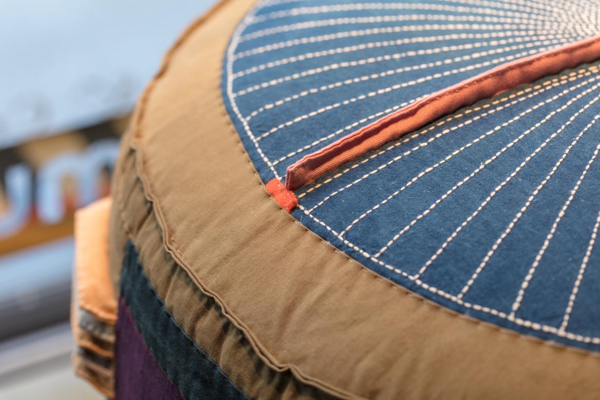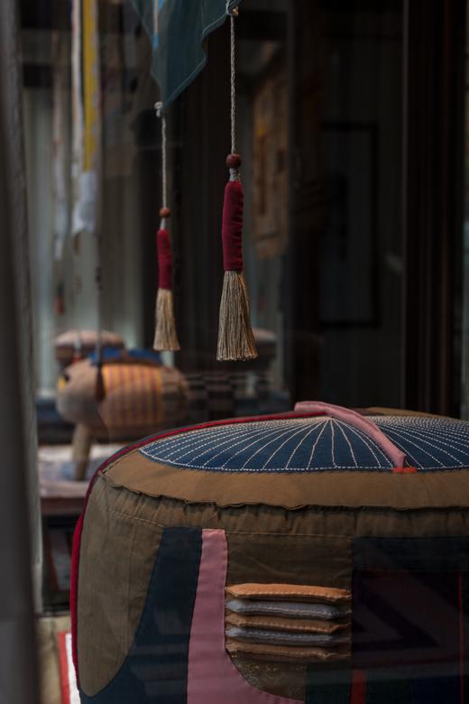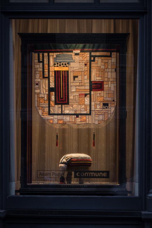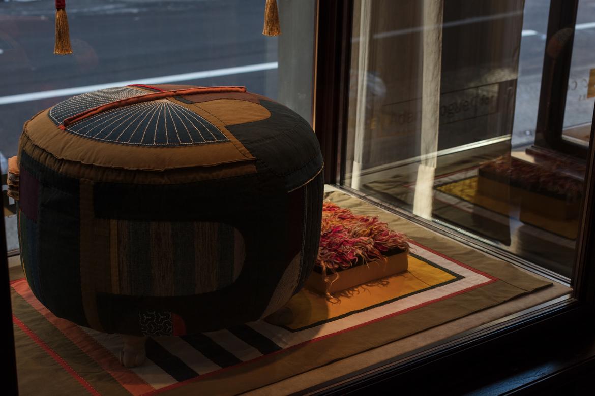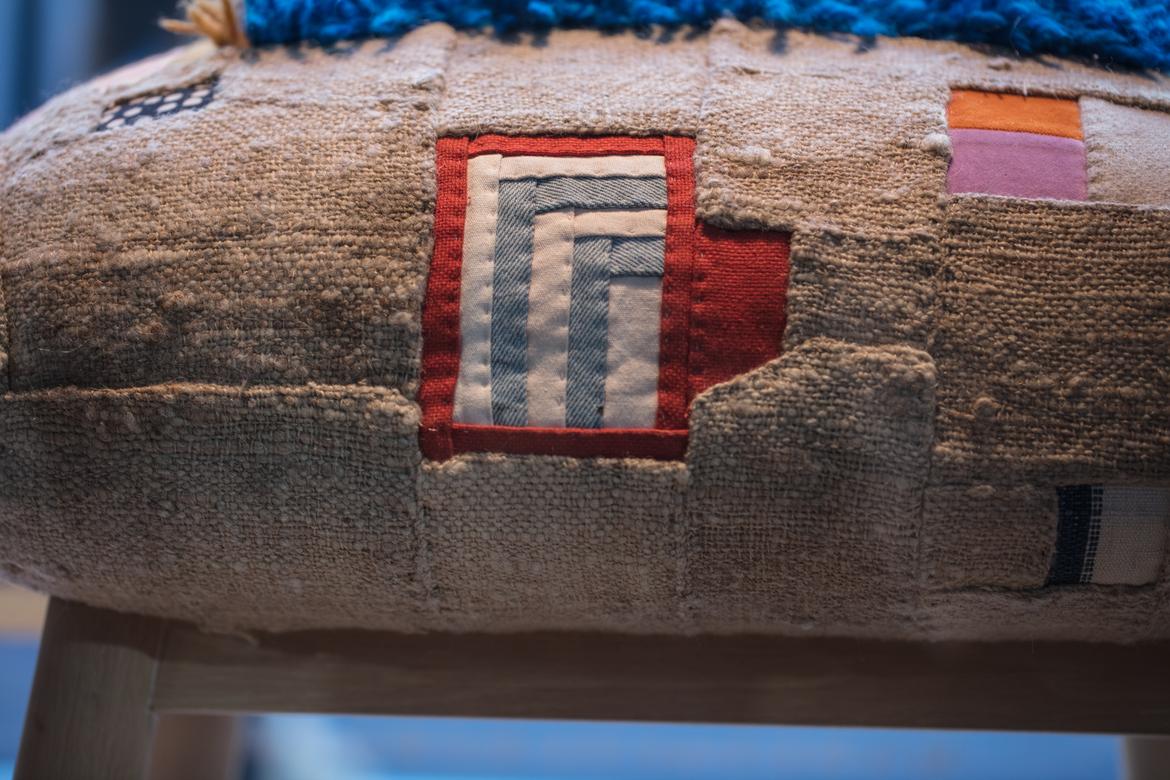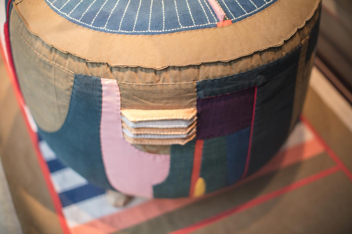 Adam Pogue works with Commune on product and special projects using textile remnants and vintage fabrics that Commune finds along the way. Obi fabrics from a trip to Japan, army canvas used for upholstery, and discarded carpet and drapery remnants are all reconfigured to create a new textile experience. Adam creates compositions that are familiar and yet completely original; with hand stitched details, pops of unexpected color, and unconventional shapes and material combinations.