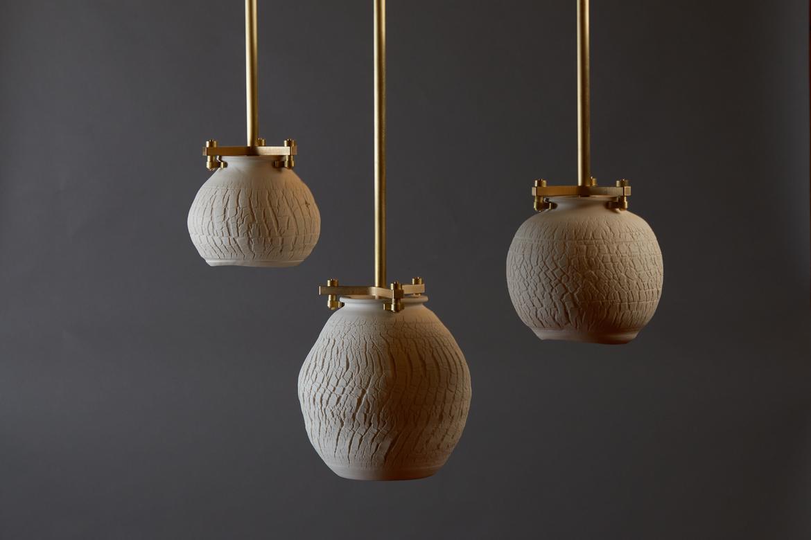 Each piece in the Desert Series is a unique work of art, made of porcelain using a unique fabrication technique developed with Paone’s paternal aunt, the ceramicist Anne Paone. Two new additions in this series, the Desert Table Lamp and Large Desert Pendant in the Negative Finish, offer the same visual and textural elements in an alluring shade of black with blackened brass hardware. The Negative Finish, conceived with new collaborator ceramicist Jeff Nimeh, takes the original series and inverts the aesthetic using metallic oxides and carbonates.