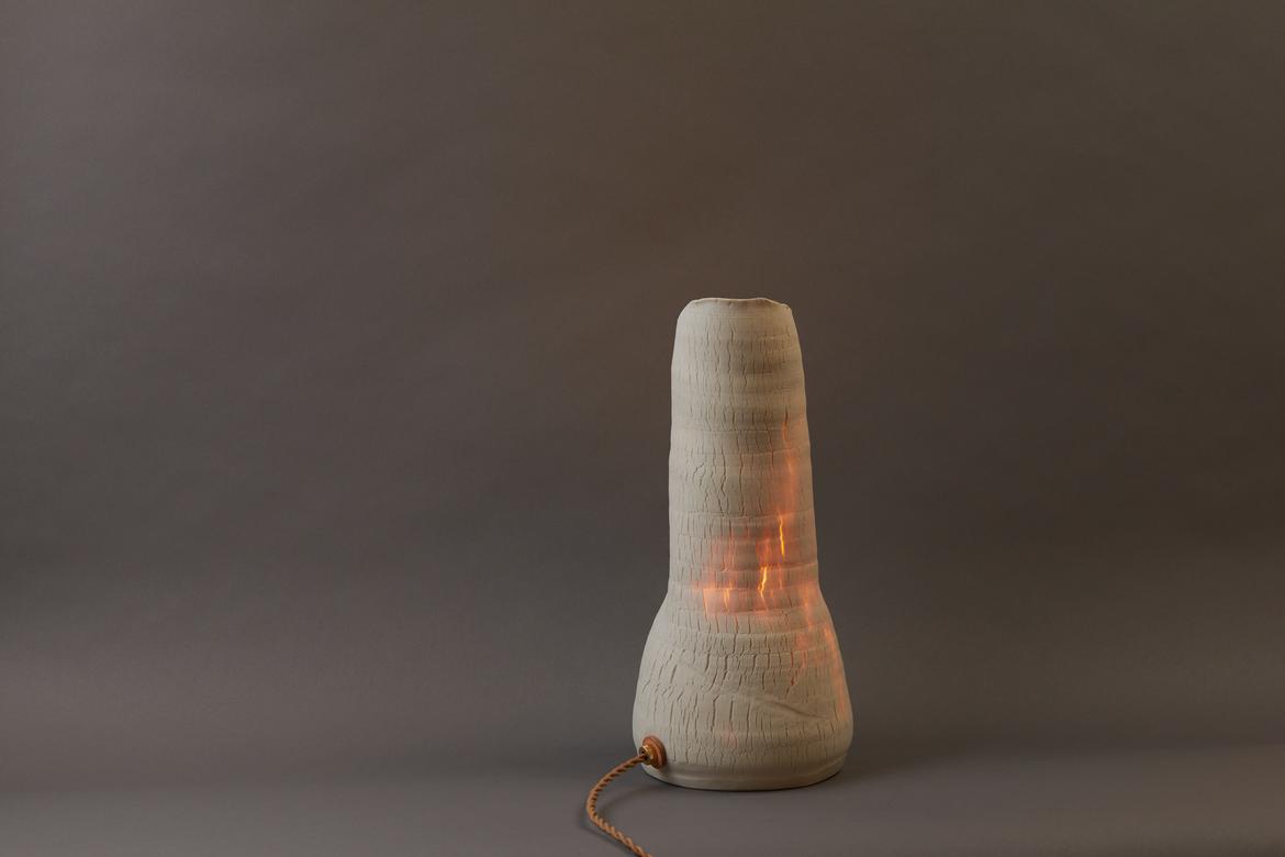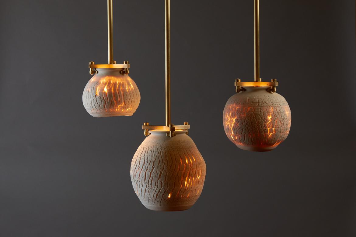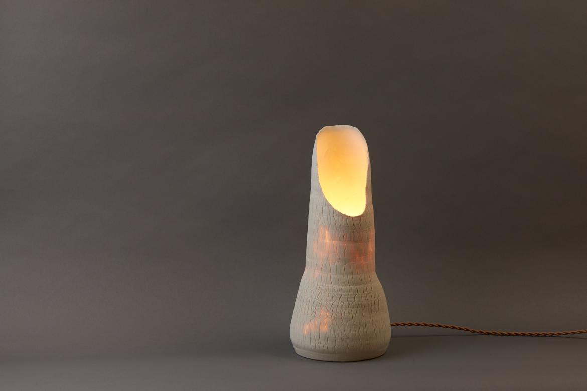 Inspired by the beauty of a dried-out desert lake bed, each piece is a handmade one-of-a-kind object that produces a mysterious quality when internally lit, embracing the flaws and accidents inherent in the craft and process of making: the series exemplifies the wabi-sabi ethos of acceptance of transience and imperfection.