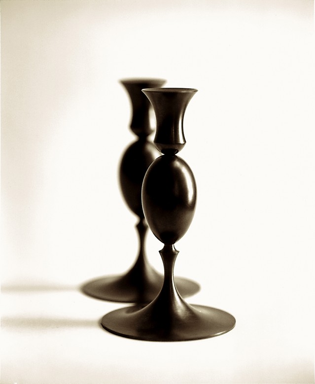 The candlesticks are based on three basic shapes: the egg, an attenuated rod, and a trumpet form. Permutations of these convex and concave shapes have yielded 5 different pieces. By combining and varying these, Muehling has created 17 different candlesticks that can be used individually, in symmetrical pairs, or in groupings of 3 or more. They are available in burnished brass, oxidized bronze, polished or pumiced sterling silver plate, or pumiced 24k gold plate. The darkened bronze accentuates the silhouette, emphasizing a neoclassical origin, while polished or pumiced surfaces enhance the play of light on the forms.